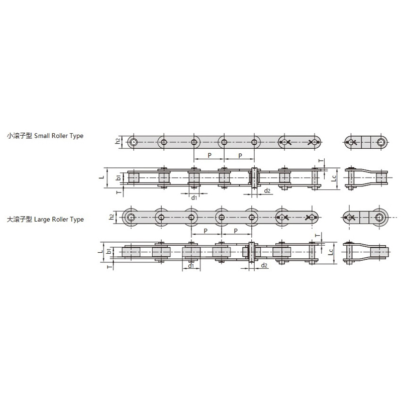 • Padidintas žingsnis:Žingsnis yra dvigubai didesnis nei standartinių grandinių, todėl pagerėja įtempių pasiskirstymas ir pailgėja grandinės tarnavimo laikas.